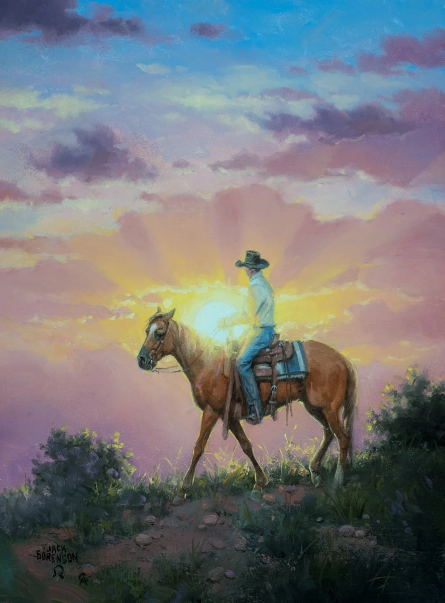 Though born in 1954, Jack Sorenson grew up living the Old West lifestyle that he now depicts in his work! Coming of age living and working at Six Gun City, a dude ranch and frontier town situated on the rim of the Palo Duro Canyon and owned by his father, Sorenson was deeply embedded with a love of all things western. Whereas other teenagers spent their adolescence working in retail or fast food, Sorenson worked as a stagecoach driver, a performance gunfighter, and a horse breaker. A naturally gifted artist since childhood, Sorenson began painting full-time in 1974. After his first one man show sold out the same year, Sorenson committed himself to a career in art. His paintings have appeared on more than eighty magazine covers including Wester Horseman, The Cattleman, America’s Horse and The Quarter Horse Journal. His Leanin’ Tree Christmas and Greeting Cards have sold in the millions. Sorenson feels he is Blessed to make the living painting cowboys and the scenes he loves. He has often said, “I’m in exactly the right place at exactly the right time, doing exactly what God wants me to do. You can’t ask for more than that.”