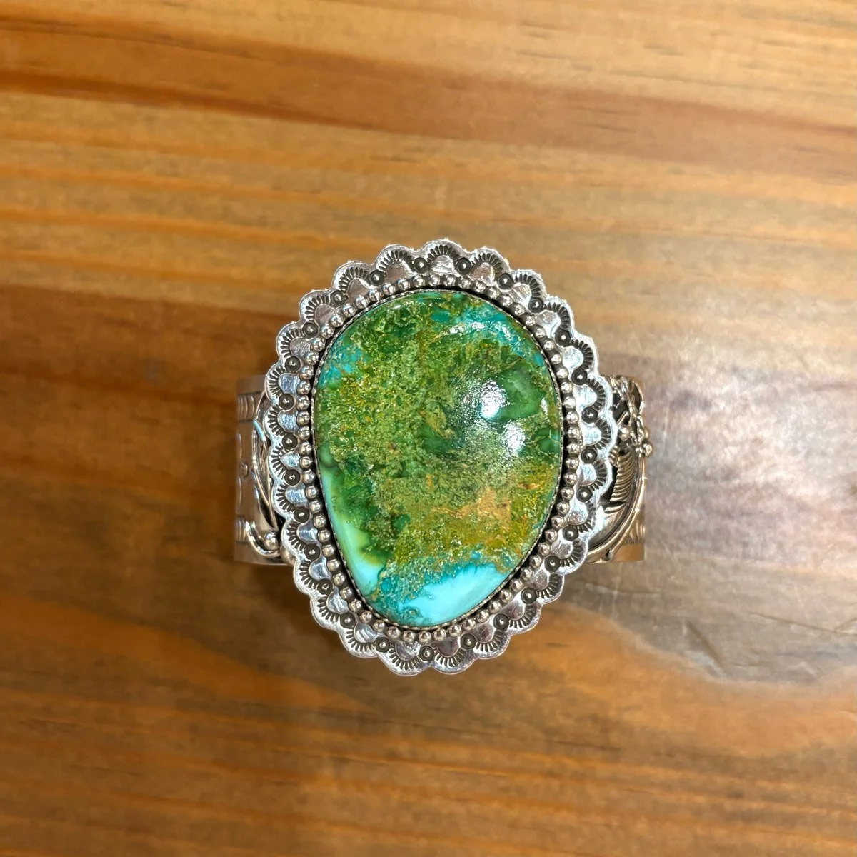 View fullsize #26 Mojavi Green Turquoise and Sterling Silver CuffJ. Piaso Jr.For Sale Inquire View All