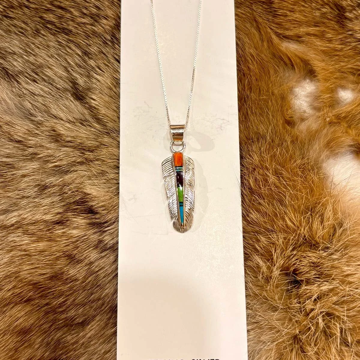 View fullsize #28 Zuni Style Multi Stone Inlay Small Feather Sterling Silver NecklaceFor Sale Inquire View All