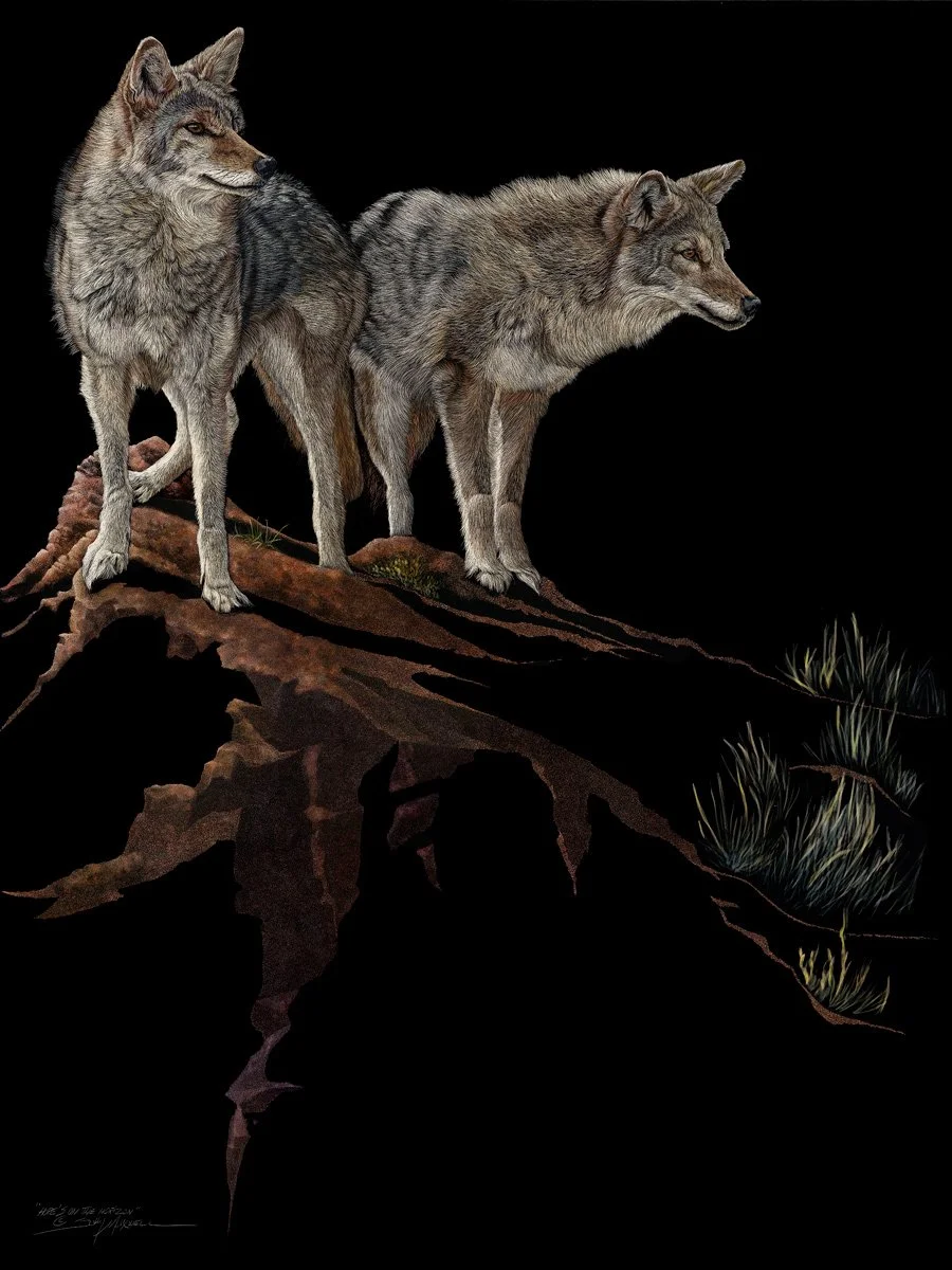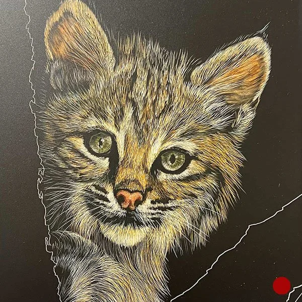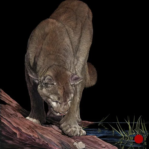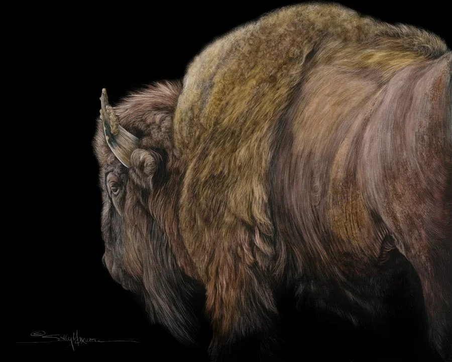 A native of Illinois, artist Sally Maxwell has been working with scratchboard for close to 53 years. Shown in galleries throughout the United States, her work is renowned by private and corporate collectors for its ability to capture the beauty and emotion of the wildlife and the natural world. Since childhood, Sally has found inspiration in animals and her own colorful garden; each piece is like a snapshot of the intensity that nature can possess in its quiet moments. Sally’s work tells stories and suggests relationships through subtle details such as the way two creatures lock eyes or snuggle next to each other. Sally has helped to define scratchboard as a fine art medium; using similar techniques to etching, or engraving, scratchboard originally was used for magazine illustration and for products in catalogs. Working with scratchboard allows Sally to layer up rich, deep colors and capture minute details, and her innovation and experimentation with new tools has given her the ability to produce a softer, less linear technique. Sally was selected by the International Society of Scratchboard Artists to be designated as one of now 12 in the world with the status Master Scratchboard Artist. She is already a Signature member in the Society of Animal Artists, and a Silver Signature member of Artists Changing Tomorrow, plus a Master Signature member of American Women Artists. Sally has created over 30 scratchboard kits for Ampersand Art Materials and authored 3 books on scratchboard technique, including “How To Draw Pets” and “How to Draw Zoo Animals”. Plus, a full one-hour video on many techniques. In 2007, Sally was honored to have one of her pieces chosen as the label for Ampersand Art Materials Scratchboard product. Sally works from her studio in the countryside of La Grange, Texas, where she lives with her husband, George. She takes frequent trips with friends and family, always with a digital camera to capture interesting flora and wildlife she finds on her adventures.